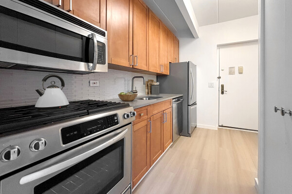 Renovated north facing large studio with custom cabinetry and stainless steel appliances in the kitchen. Living room and bedroom both with excellent closet space. CD 280 is a post-war elevator building with fitness center, laundry, courtyard, running track, and in-house Resident Manager.