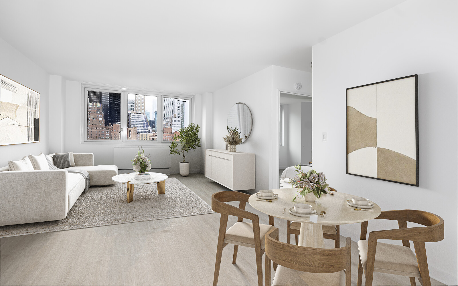 Newly renovated spacious FLEX 2-bedroom has great light and open views. The galley kitchen is off the large living room and leaves a large open, expansive space, an easy flex to a share two-bedroom. The kitchen features custom solid wood cabinetry, stainless steel appliances, and quartz countertops. In addition, this home comes with abundant closet space. A 24-hour doorman building, The Murray Hill has a fantastic staff with Resident Manager, a landscaped and furnished roof deck. Complimentary amenity package offers membership to fully-equipped fitness center, tenant lounge and bicycle storage.